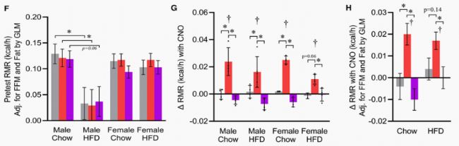 Figure6 1型AgRP神經(jīng)元內(nèi)Gαi的激活足以刺激RMR;F、注射CNO前的RMR,由GLM校正身體成分;G、注射CNO后RMR的變化;H、注射CNO后RMR的變化(性別合并),通過(guò)GLM校正身體成分。