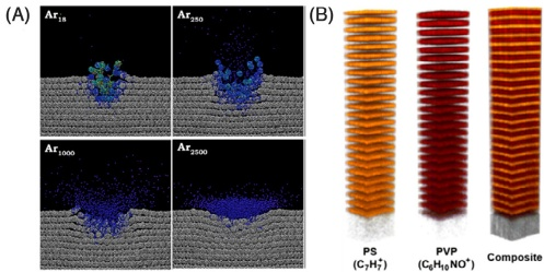 圖A.用Arn(n = 18、250、1000和2500)集束彈丸轟擊后3 ps時時間演化快照的橫截面和放大側(cè)視圖的分子動力學(xué)模擬。