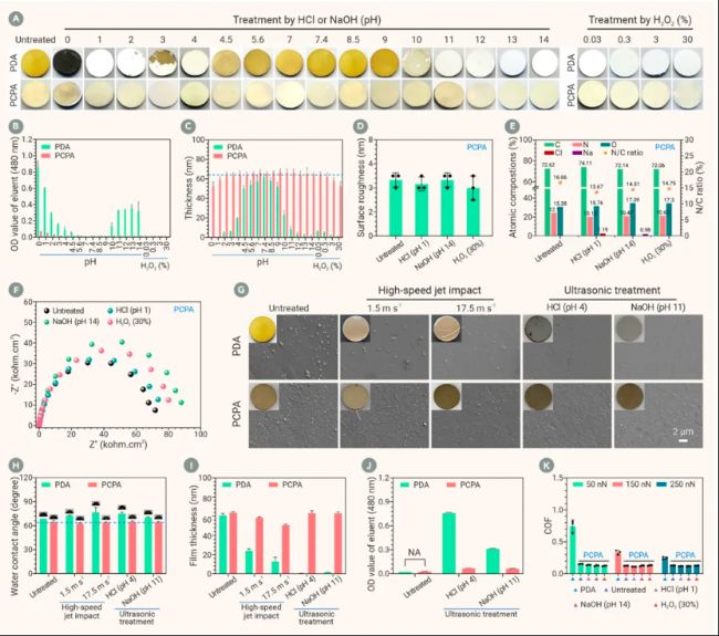 生物功能表面的持久性對于生物醫(yī)學(xué)植入物的長期服役至關(guān)重要。通過強酸、強堿、和氧化劑進(jìn)行極端處理后,所有結(jié)果都表明PCPA涂層實現(xiàn)了牢固的生物分子的強大拴系。進(jìn)一步證明了涂層穩(wěn)定的結(jié)構(gòu)是抵御化學(xué)侵蝕、維持生物分子持久功能效應(yīng)發(fā)揮的保障(圖4)。