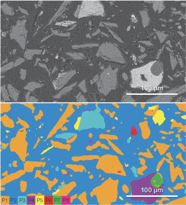 熔融氧化鋯莫來石和棕色熔融氧化鋁,以兩種不同類型難熔氧化物顆粒的雜質(zhì)鑒定為例。熔融氧化鋯莫來石應(yīng)該僅包含氧化鋯和莫來石。通過飛納電鏡 ChemiPhase物相分析軟件揭示了莫來石(P1)和氧化鋯(P2)的形狀和數(shù)量,以及一種熔點低、富含蘇打和二氧化硅的不良污染物(P3)(圖3)。