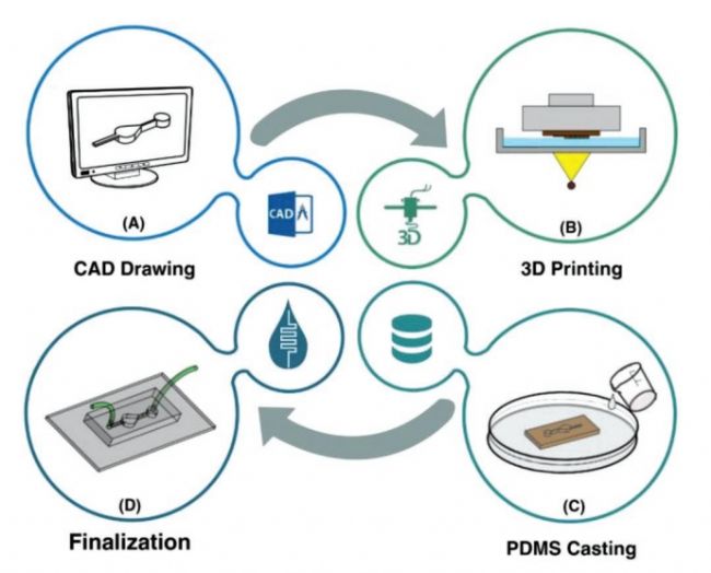 圖1:3D打印樹(shù)脂母模-PDMS倒模得到微流控芯片的示意圖