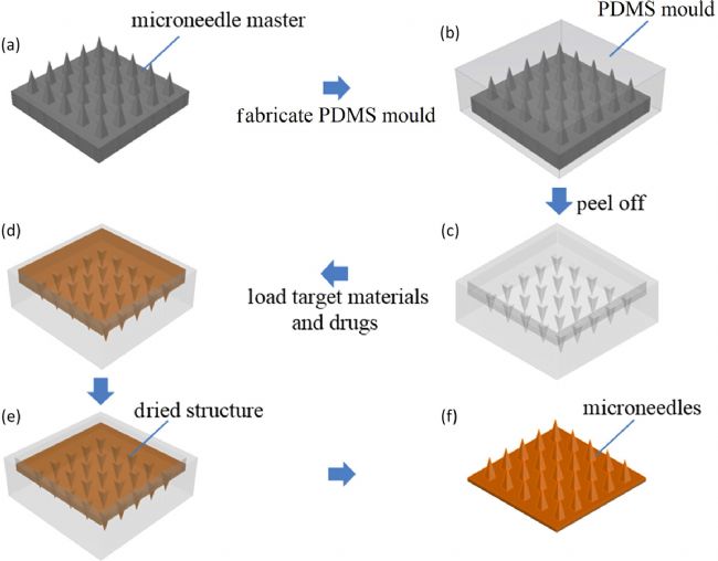 圖3:功能性微針制造工藝示意圖,涵蓋微針模具鑄造、PDMS翻模、目標(biāo)材料和藥物的復(fù)合微針制備
