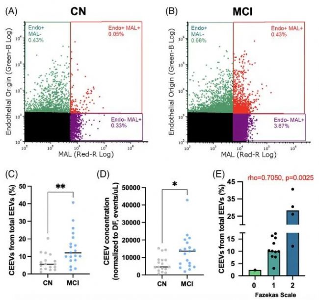 Fig.5。輕度認(rèn)知障礙(MCI)患者的腦血管內(nèi)皮細(xì)胞外囊泡(CEEVs)增加。年齡匹配對照(CN) (A)和MCI (B) CEEV的散點(diǎn)圖。通過內(nèi)皮和MAL陽性囊泡的數(shù)量除以所有內(nèi)皮源性囊泡(EEV)的數(shù)量(內(nèi)皮+/MAL+除以內(nèi)皮+/MAL++內(nèi)皮+/MAL-)并以百分比表示(C)來評估腦血管與其他血管囊泡的比率。圖C顯示MCI中CEEV%與CN相比顯著增加。圖D顯示,與CN相比,MCI中CEEV濃度(事件/μL)顯著增加。圖E顯示CEEVs在Fazekas評分患者中的分布。CEEV%與WMH負(fù)荷增加有顯著相關(guān)。