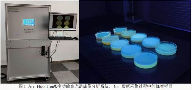 ®實驗室技術人員以三款椴樹蜜(北方地區(qū)的特色蜜種,來源于椴樹花蜜)和兩款其他花蜜為實驗對象,使用FluorTron®多功能高光譜成像分析系統(tǒng)通過對蜂蜜樣品進行紫外光激發(fā)的生物熒光數(shù)據(jù)采集及分析,展現(xiàn)了其在蜂蜜品質(zhì)鑒定中的非凡能力。