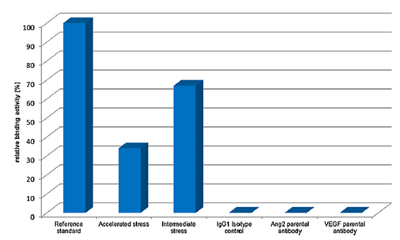 在文章中也提及了faricimab雙抗是由VEGF、Ang-2特異性抗體組成的,所以研究人員也分別用單型親本抗體進(jìn)行了特異性測(cè)試,也設(shè)置了不同的處理?xiàng)l件(例如pH、溫度),探究不同抗體的活性變化情況,結(jié)果見(jiàn)圖4?磮D可以發(fā)現(xiàn)單型親本抗體或同型對(duì)照相較參考品,均沒(méi)有信號(hào)響應(yīng),而經(jīng)過(guò)處理后的抗體的活性則有不同程度的降低,即可充分證明此效價(jià)測(cè)定方案具有強(qiáng)特異性。