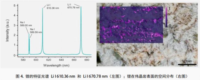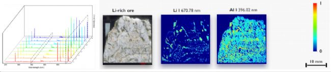 鋰可存在于多種礦物中,但僅有一部分在經(jīng)濟上可用于采礦,主要的富鋰礦物是偉晶巖中的鋰云母或鋰輝石,另一個重要來源是鹵水。測量鋰元素對幾乎所有分析技術(shù)來說都是一項具有挑戰(zhàn)性的任務(wù),但對 LIBS 來說并非如此,上圖揭示了FireFly對鋰礦進行鑒定和空間定量分析的應(yīng)用效果。