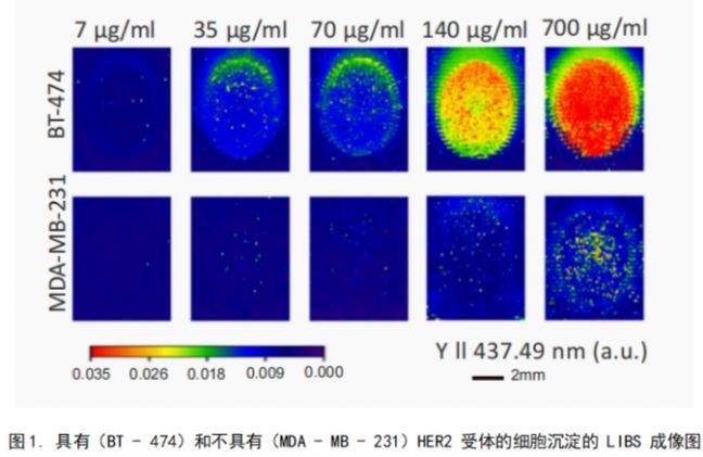 利用LIBS技術(shù)對含釔(Y ll 437.49 nm)元素的標(biāo)記物進行2D成像檢測,以替代免疫組織化學(xué)(IHC)和免疫細胞化學(xué)(ICC)等傳統(tǒng)癌細胞標(biāo)記檢測方法,突破原有生物標(biāo)記檢測技術(shù)的有用標(biāo)記范圍和低多重檢測能力的限制,有望利用不同的 NPs 標(biāo)簽實現(xiàn)生物標(biāo)記多重檢測等應(yīng)用。