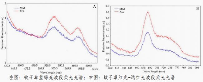 生物熒光高光譜技術(shù)則用來檢測蚊子草在藍綠光波段(430–650 nm)和紅光–遠紅光波段(650–800 nm)的特征生物熒光光譜。藍綠光波段的生物熒光與植物次數(shù)代謝水平有關(guān),在藥用植物中,這往往與藥用有效成分含量密切相關(guān)。紅光-遠紅光波段的生物熒光則屬于葉綠素熒光,其光譜變化與葉綠素濃度、PSII和PSI功能活性等相關(guān)。