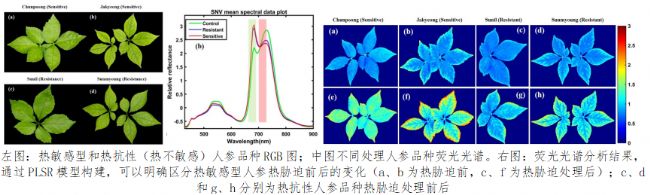 韓國(guó)忠南大學(xué)的學(xué)者在人參熱脅迫早期檢測(cè)實(shí)驗(yàn)中,使用熒光高光譜成像系統(tǒng)對(duì)四個(gè)人參品種(Chunpoong、Jakyeong、Sunil、Sunmyoung)進(jìn)行紫外光激發(fā)生物熒光高光譜成像,應(yīng)用方差分析(ANOVA)選擇最佳波長(zhǎng)生成比值圖像,將圖像轉(zhuǎn)化為二進(jìn)制圖像確定閾值,利用閾值強(qiáng)度來可視化對(duì)人參熱脅迫前后的差異。結(jié)果顯示,基于UV-MCF生物熒光數(shù)據(jù)應(yīng)用方差分析來檢測(cè)熱脅迫植物,其準(zhǔn)確度為96%。