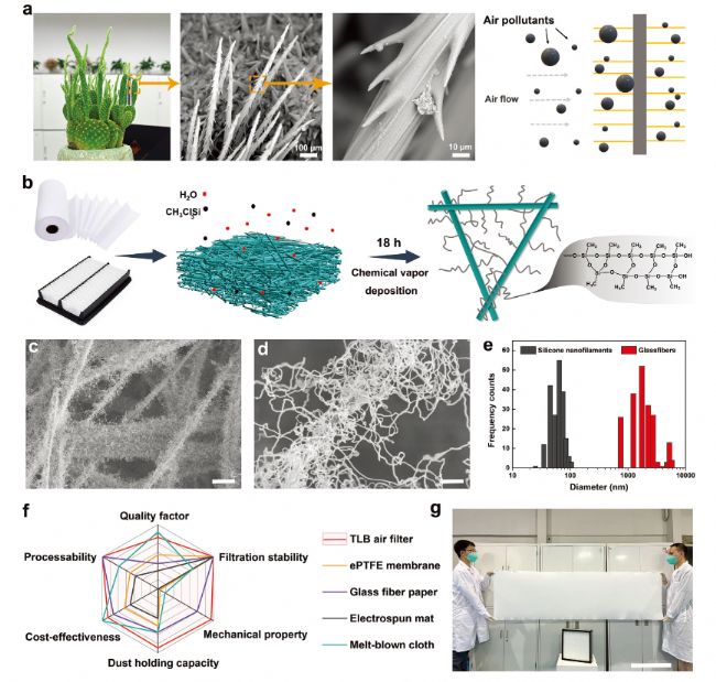 如圖1,受仙人掌的仿生概念啟發(fā)進(jìn)行了本研究過濾器的設(shè)計(jì):以三氯甲基硅烷(TCMS)為原料,商用玻璃纖維過濾介質(zhì)和過濾器作為模板基板通過簡單的CVD方法制備了3d模板化硅納米絲的TLB空氣過濾器。垂直于玻璃纖維方向的3d模板硅納米絲的毛狀分層結(jié)構(gòu),硅納米絲的平均直徑和長度分別為≈74nm和大于10μm,以隨機(jī)彎曲、鉤狀和纏結(jié)的方式展示。