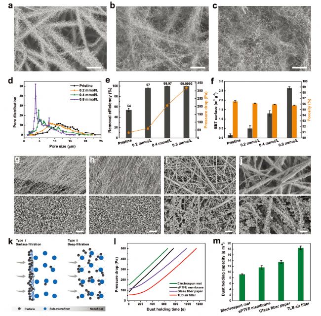 通過改變TCMS的反應(yīng)濃度(0.2、0.4和0.8 mmol L-1)來控制模板硅納米絲在玻璃纖維過濾介質(zhì)表面的生長,設(shè)計(jì)了超過五種過濾類型,發(fā)現(xiàn)隨著TCMS反應(yīng)濃度的增加,硅納米絲的數(shù)量和長度逐漸增加,納米纖維結(jié)構(gòu)可控。使用BET模型評估,TLB空氣過濾器的孔隙率(超過95%)與原始玻璃纖維過濾介質(zhì)相當(dāng),超過了大多數(shù)納米纖維過濾介質(zhì),有助于其提高過濾性能。