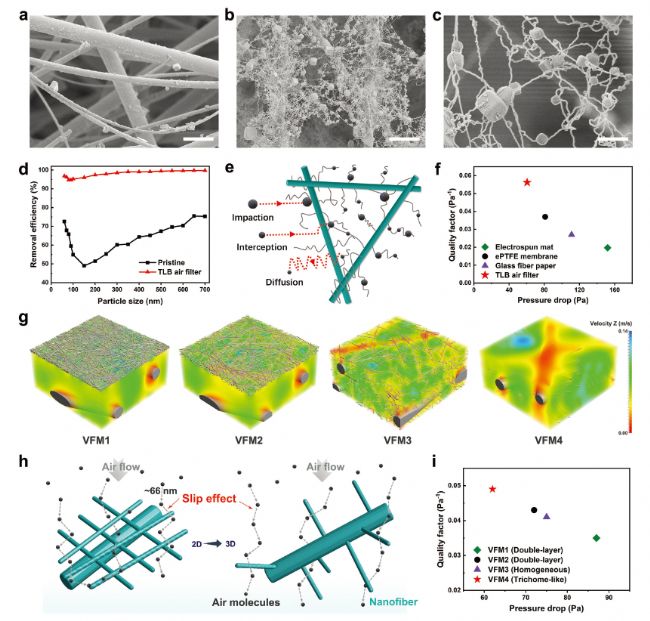 本研究基于一種簡單且可擴(kuò)展的原位CVD方法,開發(fā)了具有3D模板化硅納米絲(平均直徑≈74nm)的TLB空氣過濾器,并根據(jù)噴墨打印原理,通過MicroFab噴墨打印技術(shù),驗(yàn)證了TLB空氣過濾器的疏水性。理論建模和實(shí)驗(yàn)結(jié)果表明,通過在模板基板上創(chuàng)新性組裝三維分層納米結(jié)構(gòu)為過濾器提供了明顯的滑移效應(yīng),可以被動捕獲空氣污染物,克服了壓降和過濾效率之間的權(quán)衡。同時(shí)可選過濾等級(高達(dá)U15,≈99.9995%)滿足了各種應(yīng)用的需求,其整體過濾性能超過了廣泛使用的商品空氣過濾介質(zhì)(如靜電紡墊、ePTFE膜、玻璃纖維紙和熔噴布等)。此外,研究人員還制造了可重復(fù)使用的N95呼吸器和空氣凈化器,這些設(shè)備配備了TLB空氣過濾器,顯示出更好的空氣凈化能力,克服了現(xiàn)有過濾器設(shè)計(jì)和制造方法的局限性。