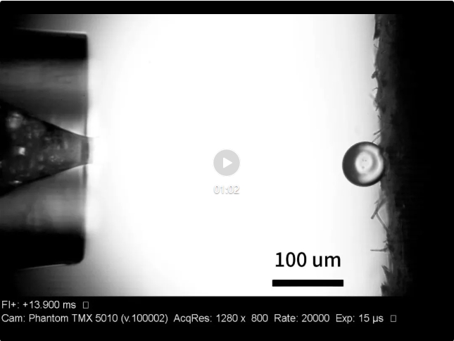 ▲ 視頻 使用MicroFab的皮升級微液滴發(fā)生系統(tǒng)控制生成尺寸約50μm的微液滴對過濾介質(zhì)表面進(jìn)行沖擊測試