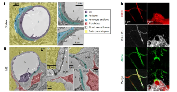 研究人員通過透明腦技術(shù)觀察ME和體感皮層腦區(qū)血管形態(tài)的差異,結(jié)果發(fā)現(xiàn)ME腦區(qū)毛細(xì)血管直徑更大,內(nèi)皮細(xì)胞密度更高,毛細(xì)血管腔由多個(gè)內(nèi)皮細(xì)胞組成,而皮層毛細(xì)血管腔由單個(gè)內(nèi)皮細(xì)胞組成。另一方面,皮層內(nèi)皮細(xì)胞、周細(xì)胞和星形膠質(zhì)細(xì)胞腳板存在密切連接,ME腦區(qū)內(nèi)皮細(xì)胞、周細(xì)胞和成纖維細(xì)胞形成緊密連接,該區(qū)域星形膠質(zhì)細(xì)胞腳板數(shù)量較少。