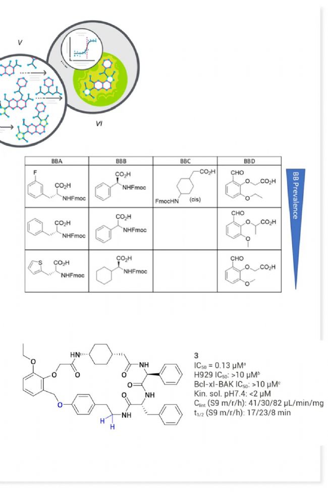 使用 DNA 編碼環(huán)肽庫(kù)和 DEL 篩選來(lái)直接篩選結(jié)構(gòu)復(fù)雜的大環(huán)化合物得到 3 個(gè)苗頭分子,但是溶解性和透膜性差,以及活性需要進(jìn)一步的提升。