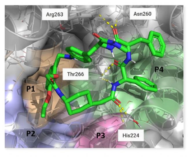 保持大環(huán)骨架不變,針對(duì)性的對(duì) P1’口袋處的側(cè)鏈進(jìn)行優(yōu)化。引入苯環(huán)進(jìn)一步占據(jù) P1’口袋,活性可以提升 100 倍,苯環(huán)上再引入柔性基團(tuán)可以提升透膜性,引入雜原子或者新的基團(tuán)降低 LogD,可以提高溶解性,最終得到 2 個(gè)先導(dǎo)化合物 57/59,適合未來(lái)進(jìn)一步的開發(fā)用于疾病的治療。