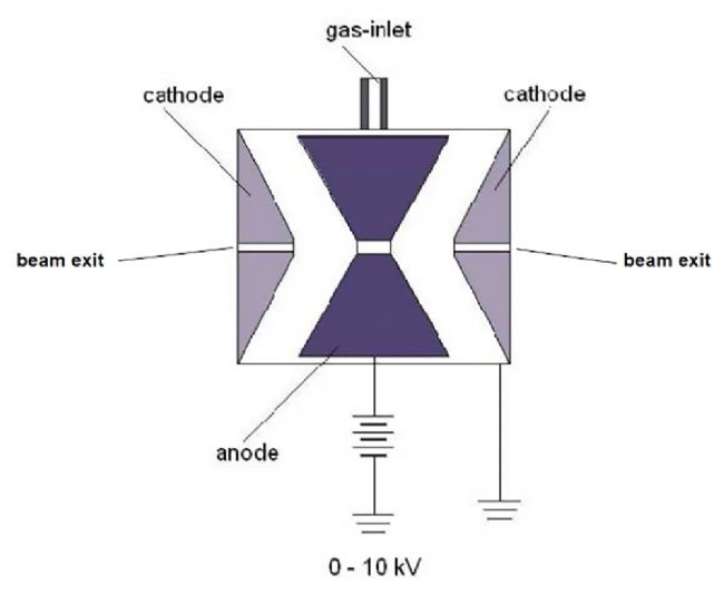 EM TIC 3X的三離子源由三把獨(dú)立的可控鞍形場離子槍組成,離子能量在1到10keV之間可調(diào)。離子源中需要輸入工作氣體,最好是氬氣。然后,向陽極上施加一個(gè)高電壓(1到10千伏),陰極和韋氏帽接地。由于陽極和陰極之間存在電場,工作氣體將被電離(Ar+),等離子體被點(diǎn)燃。帶正電的離子將被加速推向陰極,并產(chǎn)生電子,這種轟擊會(huì)磨損陰極。帶負(fù)電的電子將被加速推向陽極,與氣體原子碰撞并產(chǎn)生離子。受陽極和韋氏帽之間的電場形狀(馬鞍場)影響,兩組離子束將產(chǎn)生,并加速向兩個(gè)陰極移動(dòng)。其中一束被(盲)后側(cè)陰極阻擋,而另一束將通過前側(cè)陰極的出口射出,其離子的能量與加速電壓相匹配。