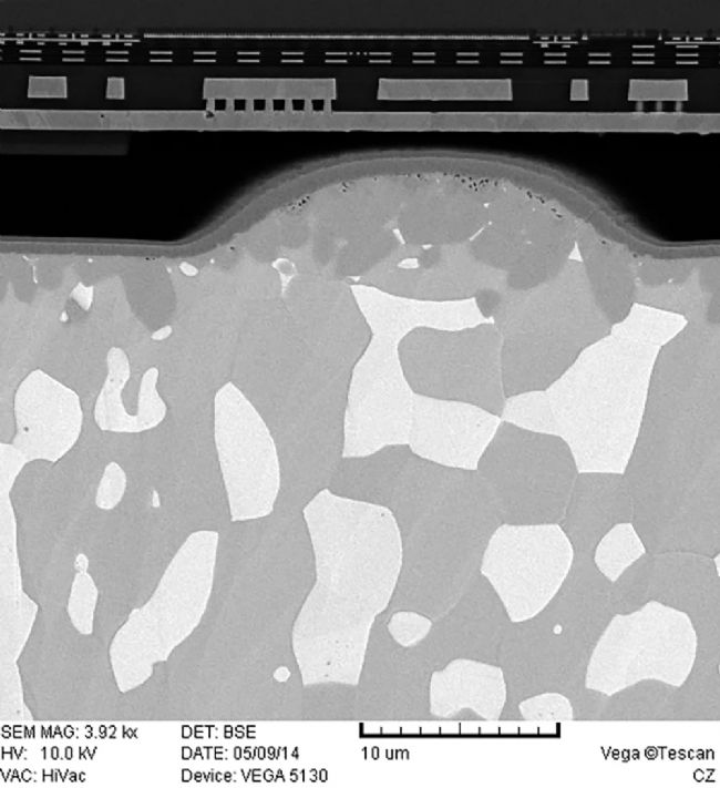 帶有焊接點(diǎn)的半導(dǎo)體結(jié)構(gòu)是一種非常柔軟的材料,較難通過傳統(tǒng)的機(jī)械拋光工藝制備樣品。離子束研磨是制備這種樣品的首選方法。為了避免焊接點(diǎn)中的各個(gè)部件收縮,在離子研磨過程中,樣品會(huì)受液氮保護(hù)保持低溫。結(jié)果顯示:樣品表面光滑干凈,焊接點(diǎn)中的結(jié)構(gòu)細(xì)節(jié)易于識(shí)別。