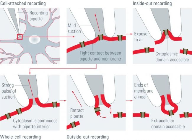 圖3:貼片鉗的四種記錄方法。細(xì)胞連接。當(dāng)移液器最接近細(xì)胞膜時(shí),施加輕微的吸力以獲得移液器和細(xì)胞膜之間的緊密密封。全細(xì)胞。通過施加另一個(gè)短暫但強(qiáng)烈的吸力,細(xì)胞膜被破裂,移液管獲得進(jìn)入細(xì)胞質(zhì)的機(jī)會(huì)。由內(nèi)向外:在細(xì)胞連接模式下,移液器被縮回,貼片與膜的其他部分分離,暴露在空氣中。膜的細(xì)胞質(zhì)表面被暴露出來。外側(cè):在全細(xì)胞模式下,移液器被縮回,導(dǎo)致兩小塊膜重新連接,形成一個(gè)小的囊狀結(jié)構(gòu),細(xì)胞膜的細(xì)胞膜面朝向移液器溶液。源于此。如果你能給我打補(bǔ)丁--什么是補(bǔ)丁夾子技術(shù)?