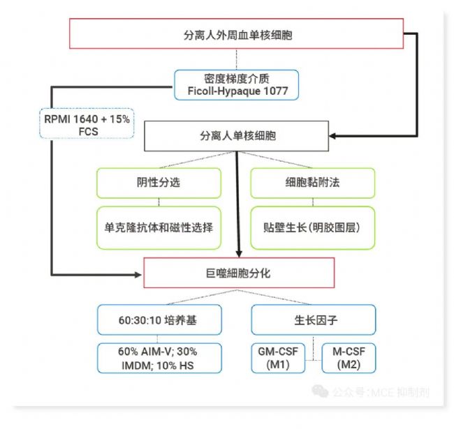 在實(shí)驗(yàn)室中通常從外周血單核細(xì)胞 (PBMCs) 或人急性單核白血病細(xì)胞 THP-1 開(kāi)始,通過(guò)加入特定的分化因子,誘導(dǎo)它們分化為成熟的巨噬細(xì)胞。