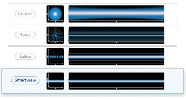 Gausslan、Bessel、Lattice、SmartView照明光片比較示意圖