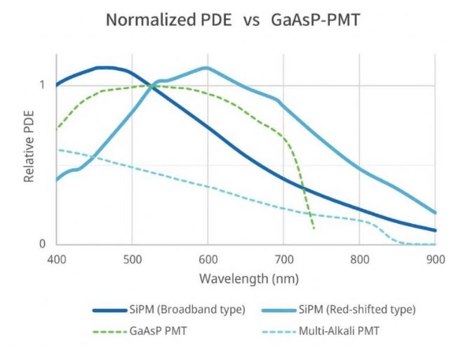 SilVIR檢測器探測效率曲線,優(yōu)于GaAsP檢測器