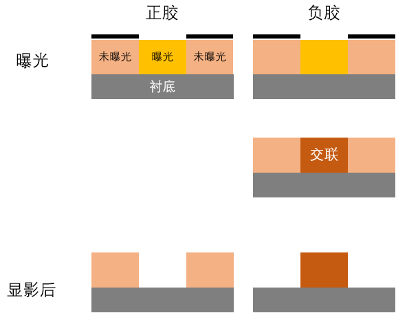 負(fù)性光刻兩種基本工藝,區(qū)別在于兩者使用的光刻膠類型不同。