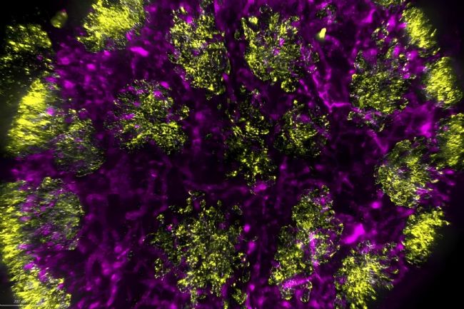 第 12.5 天的小鼠胚胎腎臟。E-Cadherin(紅色),非特異性(綠色)。樣品由 Kristen Kurtzeborn 碩士制備,由芬蘭赫爾辛基大學腎臟發(fā)育組 Satu Kuure 教授提供使用。樣本由 Immuno Diagnostic Oy 的 Janne Ylärinne 博士進行成像。
