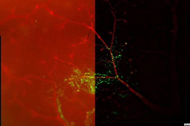 小鼠大腦皮層,血管周圍空間顯示 500 nm 綠色熒光珠。血管用與 Alexa 594 熒光團連接的 WGA 凝集素染色。樣本由芬蘭奧盧大學奧盧生物中心 Mika Kaakinen 博士和 Abhishek Singh 碩士提供。樣品由 Immuno Diagnostic Oy 的 Janne Ylärinne 博士提供。
