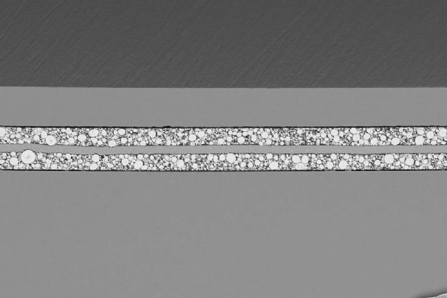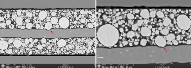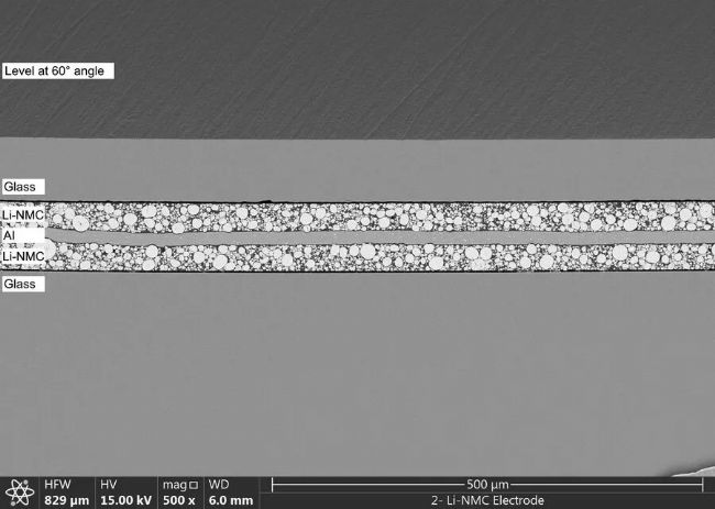 圖 2:Li-NMC 電極完整樣品的 SEM 圖像展示了位于結(jié)構(gòu)中央的兩個多孔層和金屬膜。
