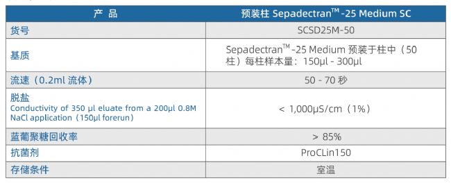 預(yù)裝柱 Sepadextran™ -25 Medium SC 是水合凝膠過濾柱,用于快速而高效地將蛋白、酶或者抗體樣品中的小分子(如:鹽、染色劑、氨等)移除。這種裝有Sepadextran™ -25 Medium 的柱子也可用于 5kDa 排阻層析的蛋白或核酸純化。