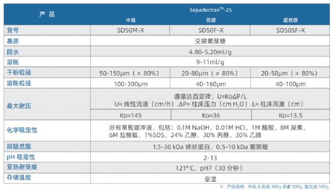 Sepadextran™ -25 可用于核酸與蛋白的純化工作,排阻極限為 5 kDa 的蛋白或10個堿基對的核酸。也可用于脫鹽(在離子交換之前,疏水層析或親和層析之后),以及更換緩沖液(在不同的層析步驟之間)和其他一些常規(guī)應(yīng)用。