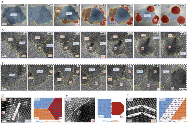 (a)系列 HRTEM 照片展示了隨溫度升高時(shí) Fe3O4 的還原行為。(b)a 圖中藍(lán)色虛線區(qū)域的高倍 HRTEM 圖展示了 FeO-Fe3O4 界面處鐵納米顆粒的成核過程。(c)a 圖中黑色虛線區(qū)域的高倍 HRTEM 圖展示了,F(xiàn)eO-Fe3O4 納米顆粒表面兩個(gè)鐵納米顆粒的聚合過程。(d)Fe3O4、FeO、Fe 的三相界面處。(e)Fe3O4 與 Fe 的兩相界面。(f)歧化反應(yīng)過程中,F(xiàn)e3O4 和 FeO 的中間結(jié)構(gòu)。