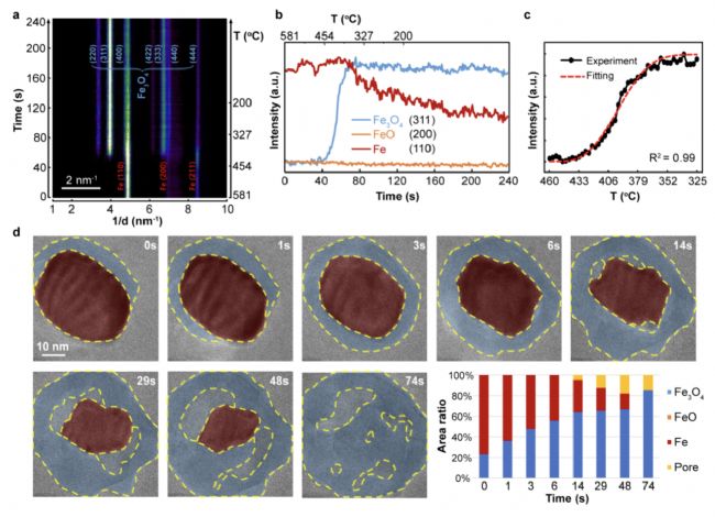 (a)位置積分的 SAED 強(qiáng)度分布圖,其中橫軸是倒空間的距離、左縱軸是反應(yīng)時(shí)間、右縱軸是反應(yīng)溫度。(b)Fe3O4{311}、FeO{200}、Fe{110} 的特征峰強(qiáng)度曲線,展示了對(duì)應(yīng)含量隨時(shí)間、溫度的變化,曲線已經(jīng)歸一化處理。(c)Fe3O4{311} 衍射從 460℃ 到 325℃ 的實(shí)驗(yàn)、擬合強(qiáng)度曲線。(d)系列 HRTEM 照片展示了隨溫度降低時(shí)鐵納米顆粒的氧化行為。Fe3O4 和 Fe 相分別用淺藍(lán)色、暗紅色標(biāo)記出。所有界面和表面分別用黃色虛線標(biāo)出。相和孔的投影面積分別以百分比疊加圖表示。