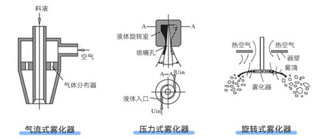 - 氣流式霧化器:利用壓縮空氣以高速?gòu)膰娮靽姵觯⑴c另一通道輸送的料液混合,借助氣液兩相間的相對(duì)速度不同產(chǎn)生的摩擦力,使料液分裂為霧滴。