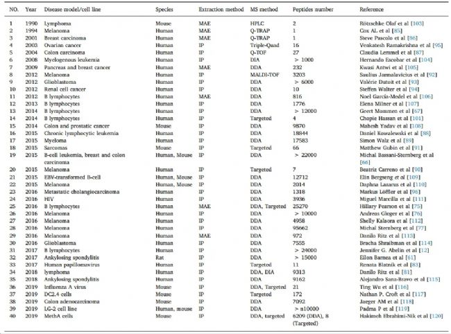 表1. 基于質(zhì)譜技術(shù)MHC免疫肽相關(guān)文獻(xiàn)的總結(jié)[3]