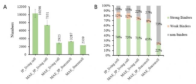 我們對(duì)免疫沉淀(IP)和酸洗脫(MAE)的分離方法進(jìn)行了對(duì)比,結(jié)果如圖3所示[4];罴(xì)胞(living cell)IP免疫肽鑒定的結(jié)果是MAE鑒定結(jié)果的3倍以上,而且IP 鑒定到免疫肽的類(lèi)型能夠覆蓋大多數(shù)MAE和MAE-IP免疫肽的類(lèi)型(~75%)。此外,MAE鑒定結(jié)果中有結(jié)合肽段的比例明顯低于IP的結(jié)果,特別是凍存細(xì)胞,MAE鑒定到更多的非特異性結(jié)合的肽段,污染物肽的比例較高。