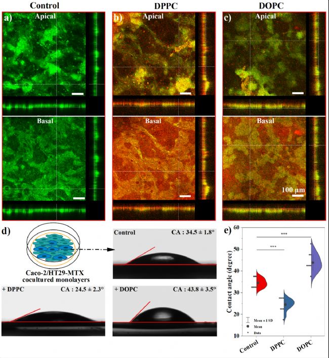 兼性的磷脂酰膽堿(PC)對(duì)于維持腸道黏液屏障功能穩(wěn)態(tài)至關(guān)重要,然而其背后的機(jī)制仍不清晰。本研究探究了飽和的1,2-二棕櫚酰-sn-甘油-3-磷酰膽堿(DPPC,16:0)和不飽和的1,2-二油酰-sn-甘油-3磷酰膽堿(DOPC,18:1)在腸道黏蛋白層表面的動(dòng)態(tài)界面吸附行為及它們對(duì)腸道黏液屏障功能的影響。耗散型石英晶體微天平(QCM-D)結(jié)果表明,表面高度水合的DPPC囊泡相比表面輕微水合的DOPC囊泡展現(xiàn)出更快、更多的腸道黏蛋白層吸附。利用分泌黏液的腸道Caco-2/HT29-MTX共培養(yǎng)模型,觀察到DPPC囊泡比DOPC囊泡更多地吸附到腸道黏液層上。此外,DPPC囊泡吸附到黏液層表現(xiàn)出更強(qiáng)的界面潤(rùn)濕性,而DOPC囊泡則相反。有趣的是,DPPC囊泡和DOPC囊泡對(duì)胃蛋白酶-胰蛋白酶消化的小麥醇溶蛋白(PTG)誘導(dǎo)的細(xì)胞損傷和炎癥因子有著出幾乎相同的抑制作用。部分的機(jī)制可能涉及分布在黏液中的DPPC囊泡和DOPC囊泡充當(dāng)外泌體的角色對(duì)PTG進(jìn)行捕獲,從而限制了PTG與黏液覆蓋的上皮細(xì)胞直接接觸。這些發(fā)現(xiàn)揭示了兼性的PC在黏蛋白層表面吸附過(guò)程中的復(fù)雜界面動(dòng)力學(xué),并闡明了PC在維持腸道黏液屏障穩(wěn)態(tài)方面的作用機(jī)制。