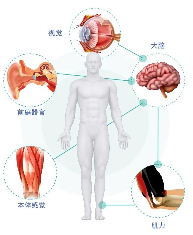 平衡位置覺受到3個(gè)系統(tǒng)的影響,分別是前庭系統(tǒng)(內(nèi)耳)、視覺系統(tǒng)(眼睛)、本體感覺系統(tǒng)(肌肉關(guān)節(jié)皮膚的感覺信息)。