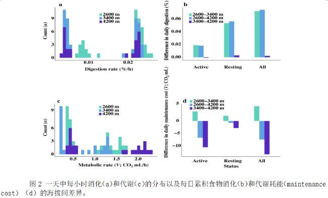 通過將野外實測的體溫數(shù)據(jù)代入各種群消化速率和靜息代謝率的溫度響應曲線,發(fā)現(xiàn)蜥蜴在休息狀態(tài)的消化速率和日累積食物消化的海拔間變異大于活動狀態(tài)(圖2)。