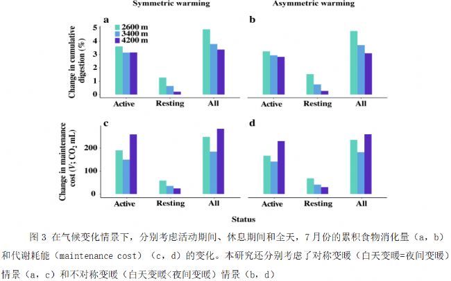 研究進一步考慮了氣候變化的影響,這里包括晝夜增溫幅度均等和夜間增溫更劇烈(眾多研究表明夜間增溫幅度高于日間增溫幅度的現(xiàn)象更普遍,尤其是在青藏高原)的兩種情景模式,發(fā)現(xiàn)休息期間累積食物消化在氣候變化下的變化量,也顯示出比活動期間更大的海拔變異。當考慮夜間增溫超過白天增溫時,氣候驅(qū)動的累積食物消化和代謝耗能在休息狀態(tài)下的變化分別增加了至少18.7%和16.3%(圖3)。