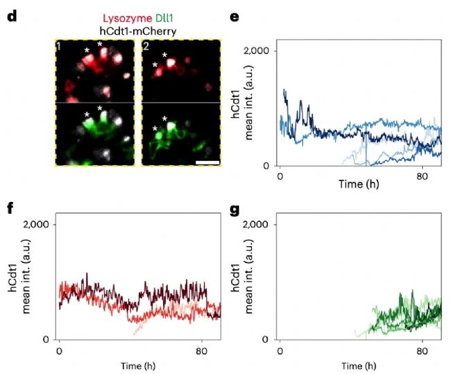 e) 對在最后時(shí)間點(diǎn)位于隱窩中的三重陽性細(xì)胞(hCdt1、Dll1和溶菌酶)的hCdt1強(qiáng)度隨時(shí)間的量化。每種顏色代表一個(gè)單細(xì)胞(n = 4)。