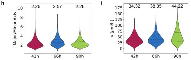 i) 胚體發(fā)育過程中在三個(gè)不同時(shí)間窗口內(nèi)成像的細(xì)胞速度的小提琴圖,顯示了中位數(shù)(圖中數(shù)值)及第一和第三四分位數(shù)。每個(gè)觀察窗口中追蹤的數(shù)據(jù)點(diǎn)數(shù)量(來自3個(gè)單獨(dú)的胚體)如下:n = 622(42小時(shí)),n = 562(66小時(shí)),n = 539(90小時(shí))。胚體在懸浮狀態(tài)下成像。