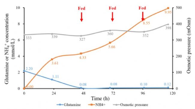 圖4 谷氨酰胺和銨離子濃度及滲透壓變化曲線