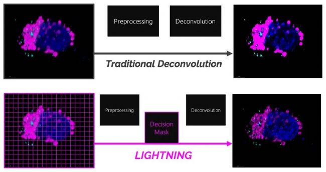 圖1:傳統(tǒng)反卷積和LIGHTNING技術(shù)之間的差異。LIGHTNING技術(shù)標(biāo)準(zhǔn)算法使用一個全局設(shè)置,確定單個體素精確的信號-背景值,以適應(yīng)每個單個像素,并允許自動批處理。