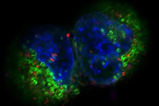圖3:共聚焦Z-堆棧的投影。Sum159細(xì)胞和乳腺癌細(xì)胞由德國海德堡歐洲分子生物學(xué)實驗室(EMBL)Mahamid Group的Ievgeniia Zagoriy提供。藍(lán)色- Hoechst -表示細(xì)胞核,綠色- MitoTracker Green-線粒體,紅色- Bodipy -脂質(zhì)滴。