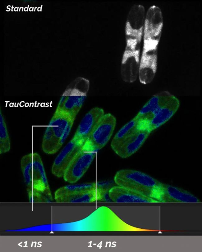 上述時間間隔被稱為熒光壽命。熒光壽命取決于熒光基團(tuán)種類及其微環(huán)境。將兩個(或多個)熒光源的貢獻(xiàn)進(jìn)行分開的能力,使TauSense技術(shù)成為生命科學(xué)的強(qiáng)大分析工具。使用TauSense技術(shù),能夠確定光子的到達(dá)時間,并開發(fā)為一個額外的維度,允許觀察微環(huán)境變化和多通道熒光基團(tuán)。