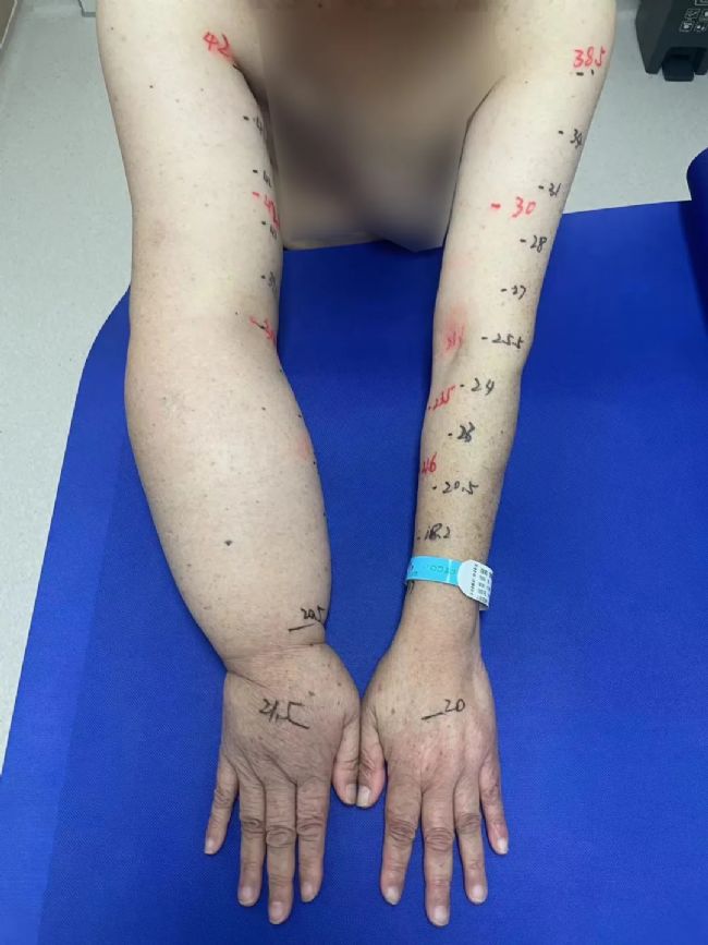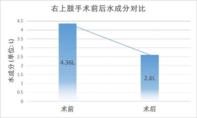 術(shù)后右上肢消腫效果良好(見上圖),水成分明顯改善,從4.36L快速下降到2.6L(見下圖,術(shù)前術(shù)后右上肢水成分分析)。