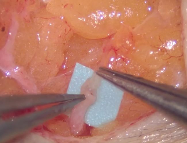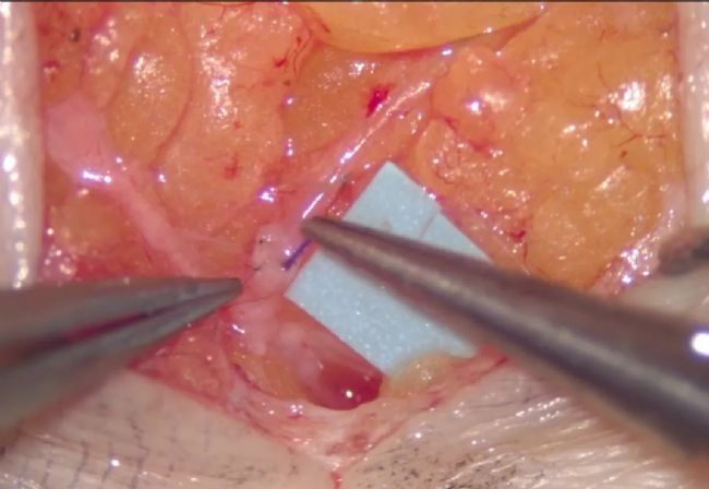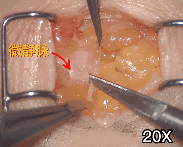 第三步,在20倍左右的倍數(shù)下將淋巴管與血管進行吻合。先把血管剪斷,同時確保血管不會發(fā)生反流。接著把血管和淋巴管擺在一起做端端吻合。我們的經(jīng)驗是會放5-0的縫線,進入淋巴管起到支撐作用,防止縫合的時候縫到的管壁對側(cè)去。使用11-0的縫線進行縫合。