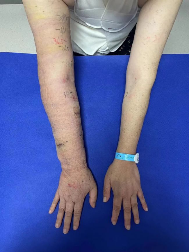 3、術(shù)后5年腫脹蔓延至前臂,抬高患肢后腫脹無法緩解。
